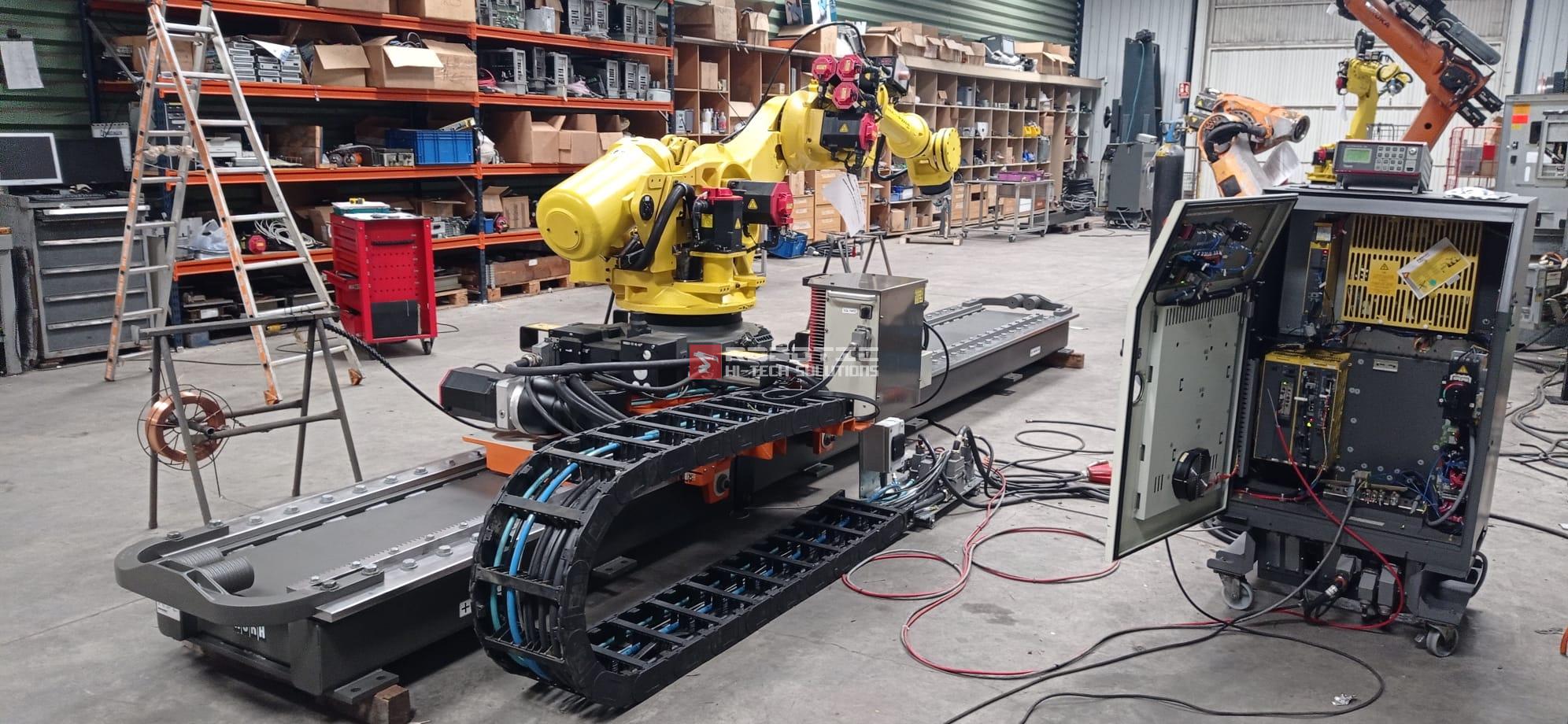Robot FANUC R-2000iB/210F, con controllore R-30iA, estensione di 2650 mm e capacità di carico di 210 kg. È interfacciato con un asse lineare esterno, dotato di unità di azionamento R-30iA, carrello scorrevole e cablaggio completo, ideale per applicazioni di asservimento presse, pick and place e movimentazione industriale.