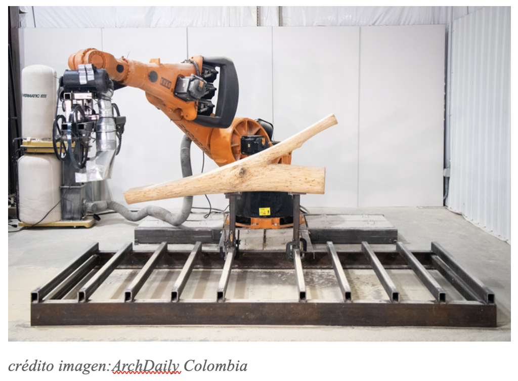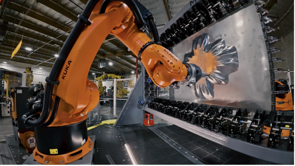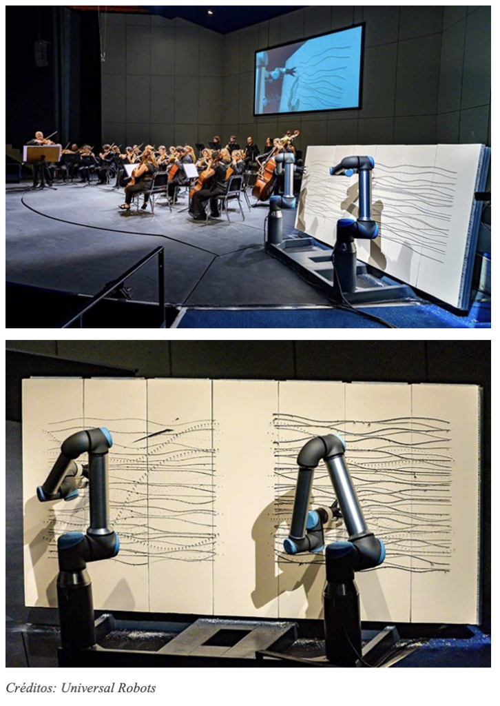 The sculpture is suspended by a chain connected to a large industrial robotic arm, similar to those used in the automotive industry. This arm is mounted on a steel structure that allows horizontal and vertical movements, enabling complex and precise choreography.